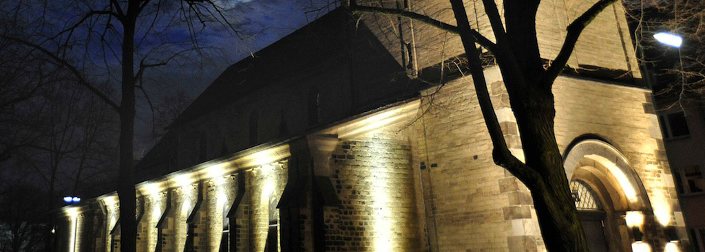 An Heiligabend war es soweit. Die älteste Kirche Düsseldorfs (Ursprung um 700) erstrahlt in neuem Licht. Die Fresken und der Vorplatz werden mit historischen LED Laternen, in ein neues Licht gerückt. Dabei benötigen die vier LED Laternen auf dem Kirchenvorplatz und die komplette Bestrahlung des Kirchturms, sowie der Außenfassade gerade einmal 850 Watt Leistung.