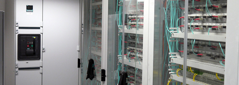 Die Spannungsversorgung der einzelnen Schrankreihen wurde mit Stromschienensystemen oberhalb der Serverschränke sowie entsprechenden Abgangskästen realisiert.